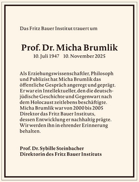 Das Fritz Bauer Institut trauert um Micha Brumlik. Von 2000 bis 2005 war er Direktor des Instituts und hat in dieser Funktion wichtige Weichen gestellt. Nach dem Umzug des Instituts in das IG Farben Haus auf dem Campus Westend der Goethe-Universität 2001 hat sich Micha Brumlik für einen angemessenen Umgang mit dem historischen Ort, der ehemaligen Firmenzentrale der IG Farben, engagiert. In seiner Amtszeit fand 2004 ein zweites Treffen von Überlebenden des KZ Buna/Monowitz im IG Farben Haus statt, es wurden wichtige Ausstellungen zum Auschwitz-Prozess und zur »Ausplünderung der Juden in Hessen 1933–1945« entwickelt und erste Schritte unternommen, eine eigene Professur zur Erforschung der Geschichte und Wirkung des Holocaust an der Goethe-Universität zu etablieren. Diese wurde 2017 eingerichtet und ist heute verbunden mit der Leitung des Fritz Bauer Instituts.
